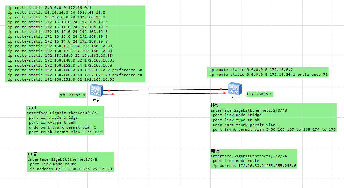 两厂之间正常是移动的数字链路。但希望当移动线路故障的时候,自动切换成电信的链路。电信的链路不支持trunk。只能使用路由。请问该怎么配置。直连路由ping是正常的。