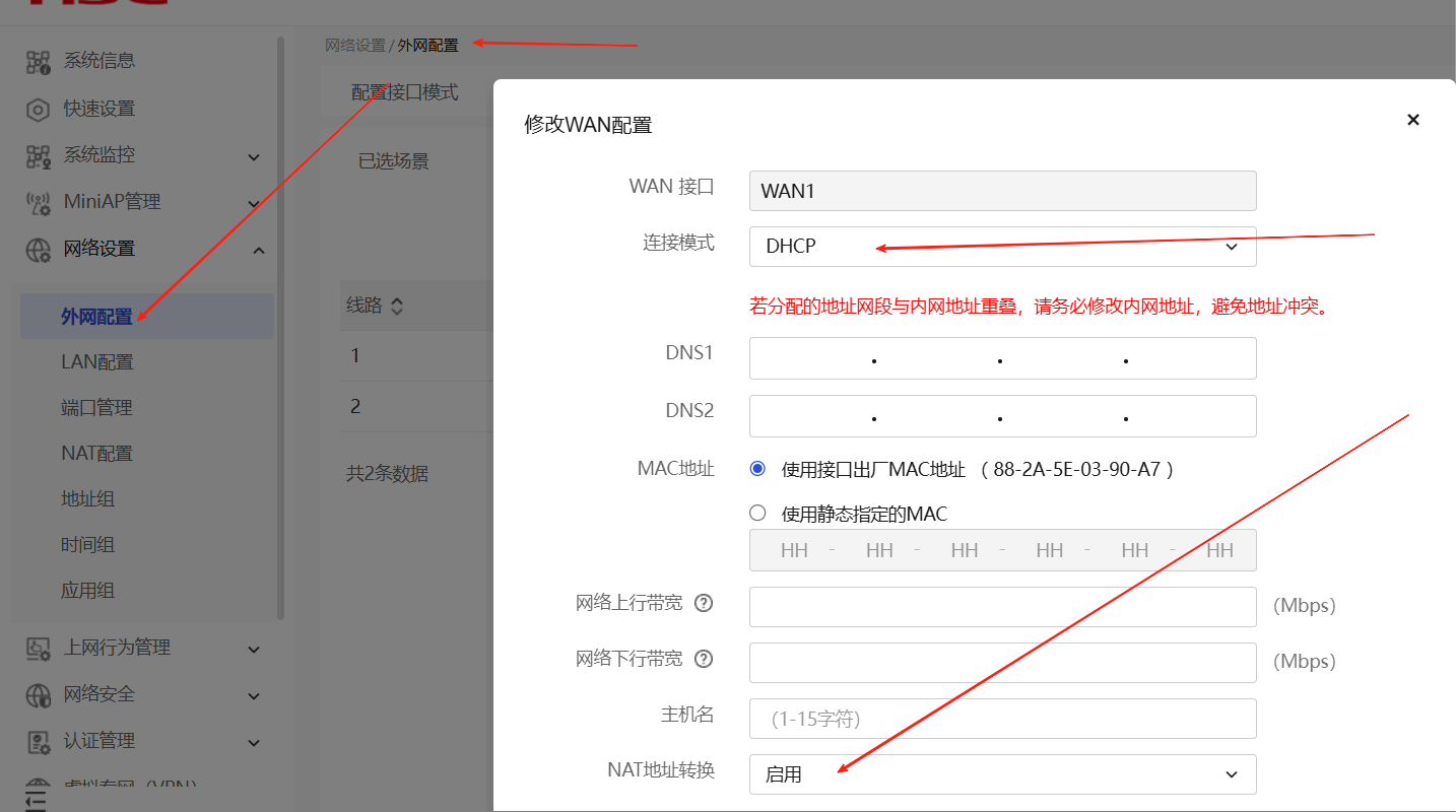 2.进入网络设置,然后根据引导设置。首先,你得和运营商通,这个让运营商拨号,然后你会自动获取一个地址,并开启NAT,不开启DHCP