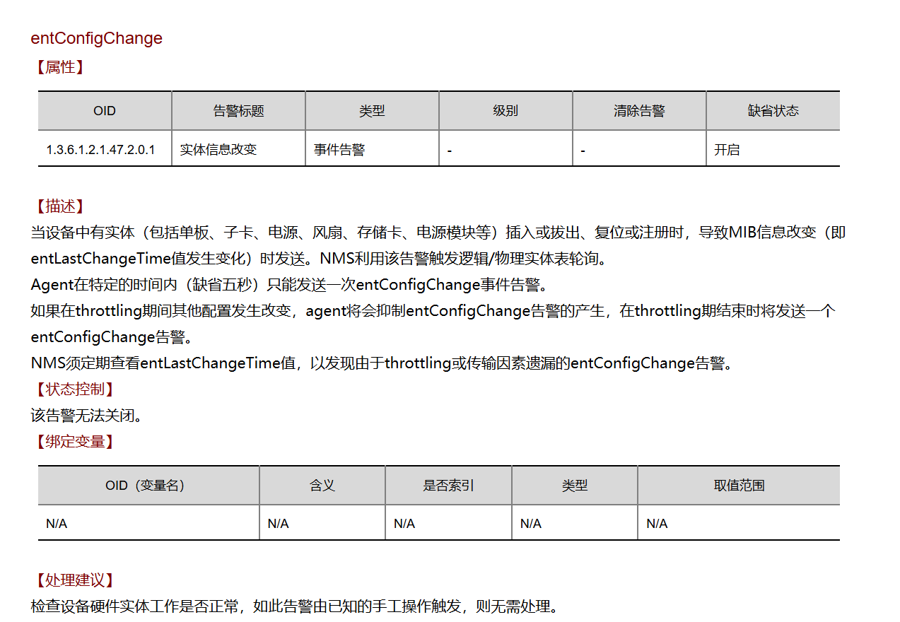• 使用模块化命令关闭:undo snmp-agent trap enable entity 或针对具体OID关闭:undo snmp-agent trap enable oid <实体变更的OID>