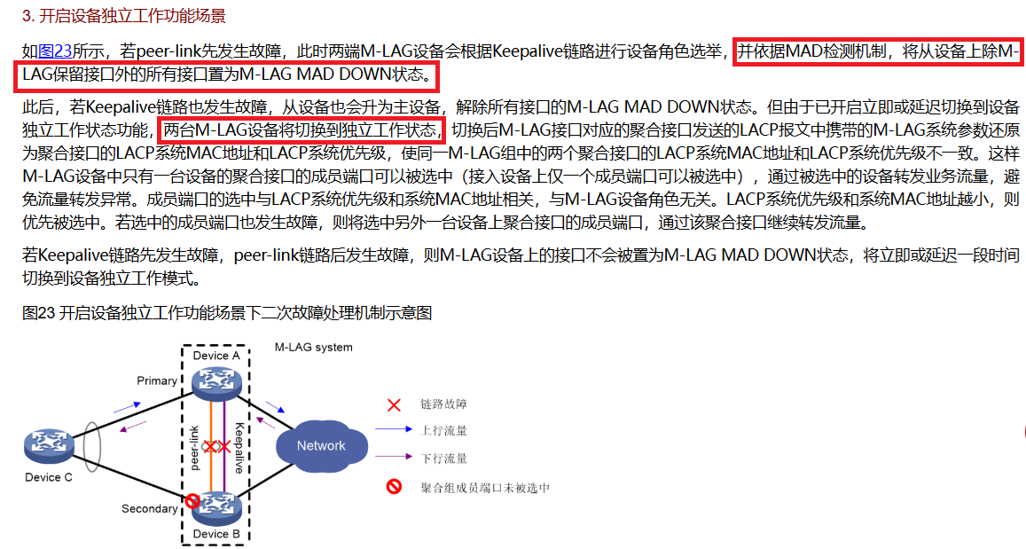 2.华三交换机m-lag的独立模式与monitor-link配合使用,但是monitor-link实现的是上行链路故障联动下行故障,反之无法实现联动,那么m-lag组网,keep先故障,peer-link故障,双主模式的方式配置独立模式结合monitor-link如何实现来回流量一致呢?