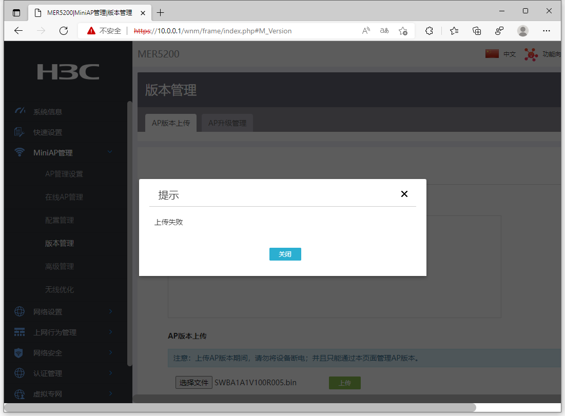 下载SWBA1A1V100R005.bin后,上传总是失败,请问怎么处理,谢谢