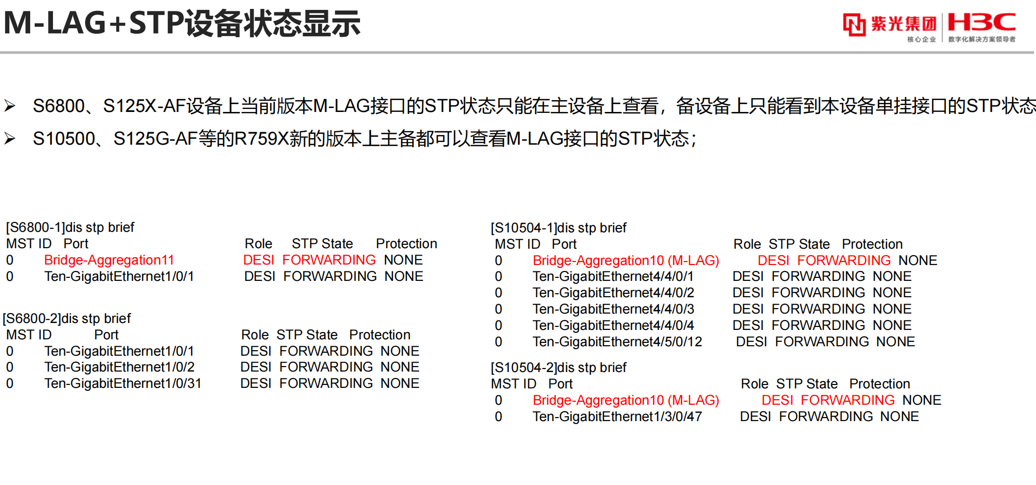 但我看了下其他设备的备机 DR接口的STP状态是显示的<H3C>dis cu | in drni port drni intra-portal-port 1 port drni group 101 port drni group 102 port drni group 110 port drni group 111 port drni group 112 port drni group 113 port drni group 114 port drni group 115 port drni group 129 drni restore-delay 180 drni system-mac 1019-xxxxxxx drni system-number 2 drni system-priority 100 drni keepalive ip destination xxxxxxx source xxxxxx vpn-instance Management drni mad exclude interface M-GigabitEthernet0/0/0 <GQ-S-LAB-0B-9850-3F-F08>dis stp brief VLAN ID Port Role STP State Protection 45 Bridge-Aggregation110 (DR) DESI FORWARDING NONE 45 Bridge-Aggregation111 (DR) DESI FORWARDING NONE 45 Bridge-Aggregation112 (DR) DESI FORWARDING NONE 45 Bridge-Aggregation113 (DR) DESI FORWARDING NONE 45 Bridge-Aggregation114 (DR) DESI FORWARDING NONE 45 Bridge-Aggregation115 (DR) DESI FORWARDING NONE 45 Bridge-Aggregation129 (DR) DESI FORWARDING NONE 46 Bridge-Aggregation110 (DR) DESI FORWARDING NONE 46 Bridge-Aggregation111 (DR) DESI FORWARDING NONE 46 Bridge-Aggregation112 (DR) DESI FORWARDING NONE 46 Bridge-Aggregation113 (DR) DESI FORWARDING NONE 46 Bridge-Aggregation114 (DR) DESI FORWARDING NONE 46 Bridge-Aggregation115 (DR) DESI FORWARDING NONE 46 Bridge-Aggregation129 (DR) DESI FORWARDING NONE 47 Bridge-Aggregation110 (DR) DESI FORWARDING NONE 47 Bridge-Aggregation111 (DR) DESI FORWARDING NONE