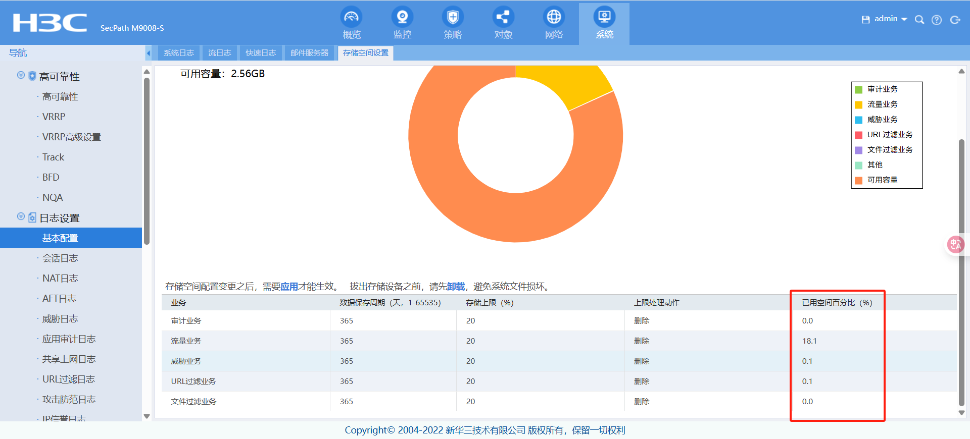 对于用户流量大的场景下空间上限为20%阈值明显太小,无法适应用户实际网络需求,因此可以将此阈值设置为80%。