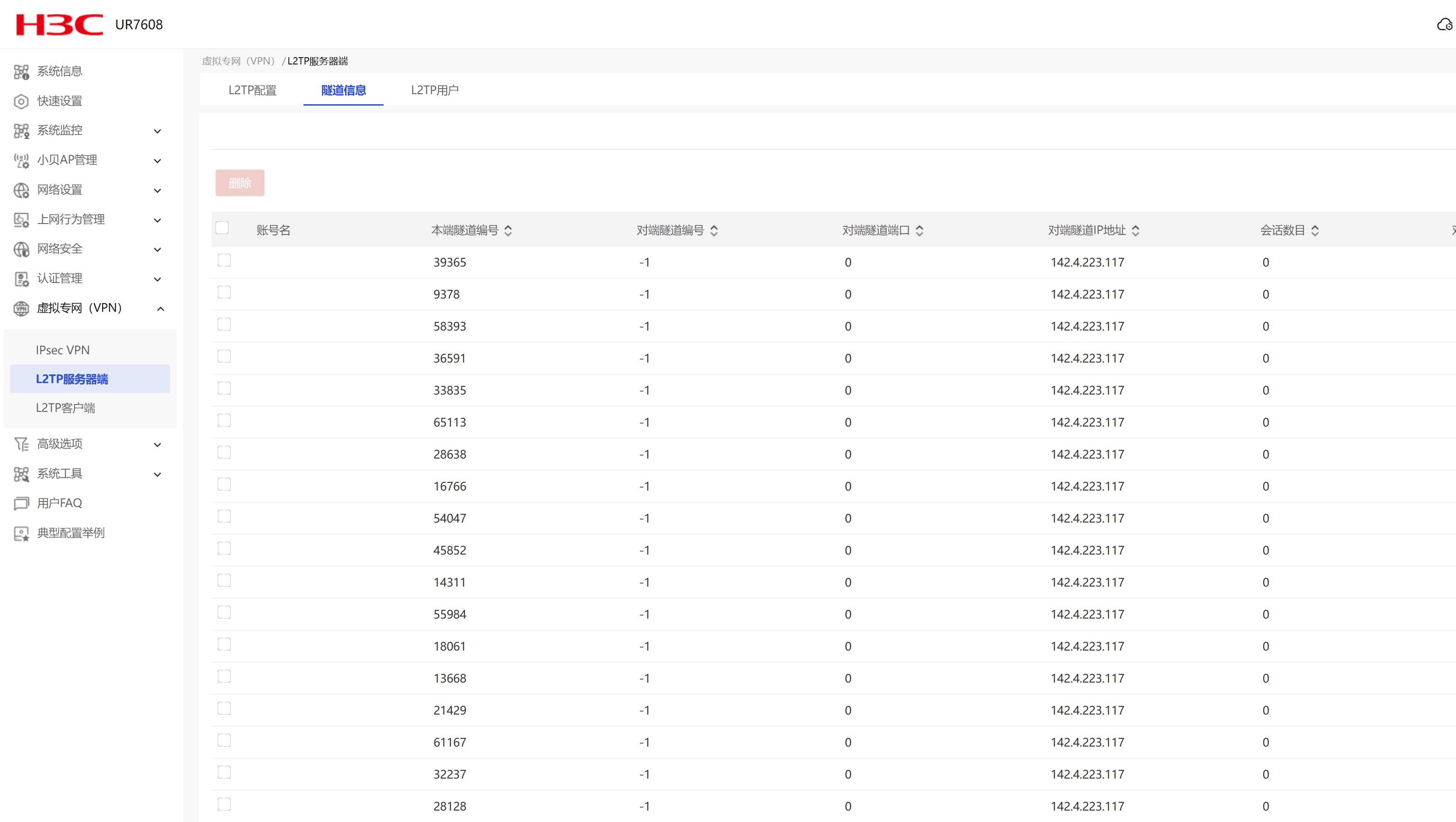 路由器UR7608,开了L2tp服务器,平时没啥事,今天同事反应无法链接。后台查看发现一堆隧道信息,IP还是国外的,这怎么办?