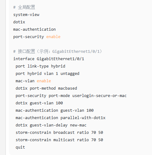 按此方法上机测试,发现2个问题:1、全局下802.1x、mac认证开关与端口安全开关冲突无法同时开启。2、在全局不开启端口安全情况下,按上述信息完成接口下配置,接入的终端在不经过认证的情况下可能获得vlan1的址连网,而不是需要的guest-vlan的地址(设备型号:S5130S-28P-PWR-EI,软件版本:Version 7.1.070, Release 6368)