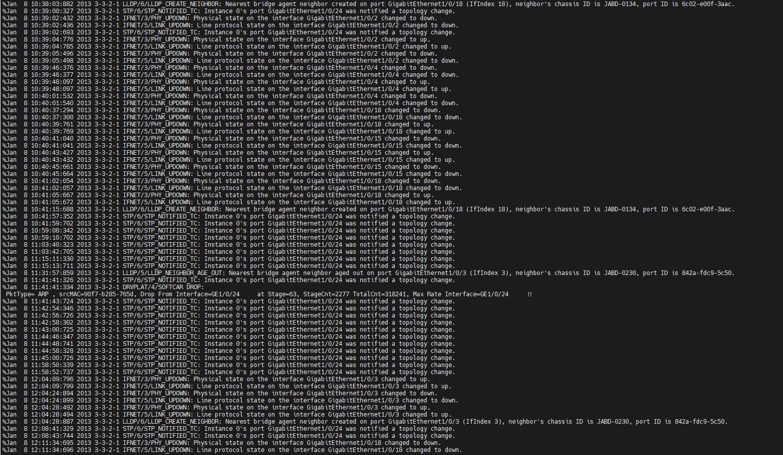 display transceiver diagnosis interface [接口] 确认收发光在正常范围(Rx/Tx功率值非负且不超过上限)。协议干扰(如STP、DLDP)