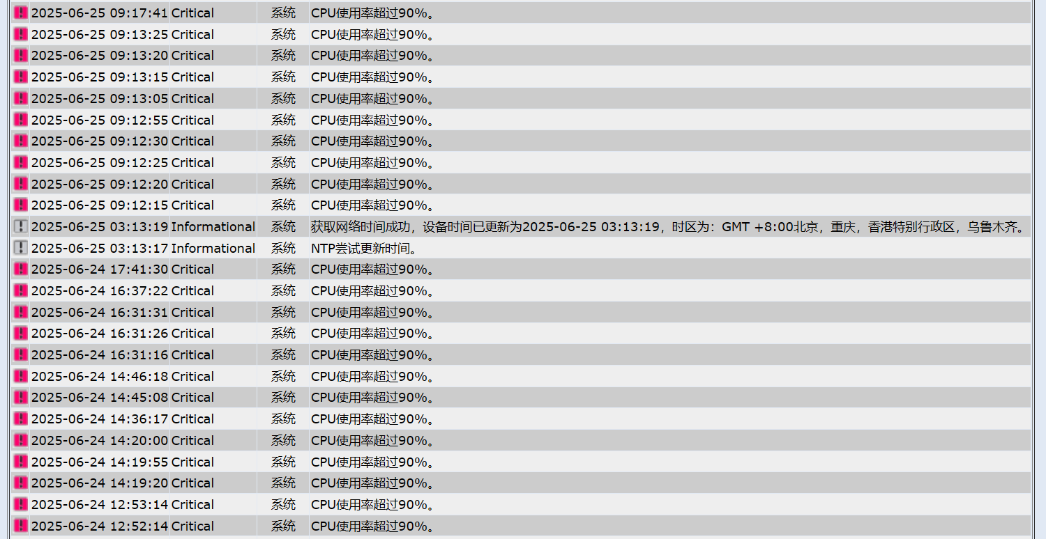 H3C ER3108G路由器CPU飙升90%,高峰使用期,cpu占用率才到百分之十几,组网如图,带宽是100M,使用人数不超100,做了qos限速,应该也不存在突发高流量导致cpu暴涨,请问是什么问题?这个告警是不准确的吗?