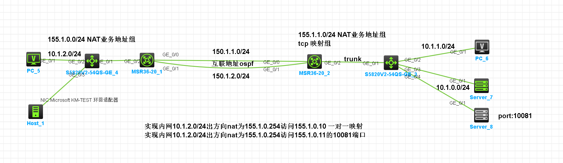 互联地址使用两组ospf冗余,业务地址使用独立的nat组。155.1.1.10地址映射需要配置在哪里。如何实现这个映射配置。