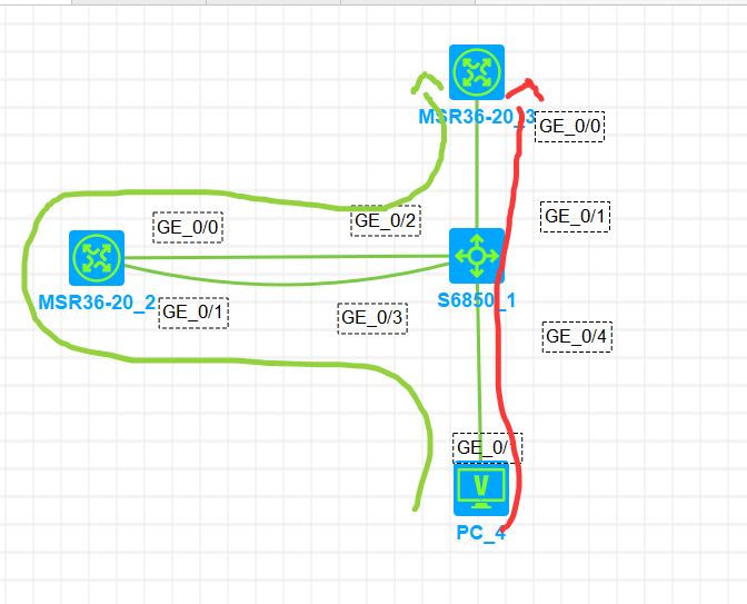 6850 是PC_4的网关VPN实例1 , 6850上面有两个实例 分别是VPN1 和VPN2 , 正常情况下流量经过MSR36-20_2 (IP 20.1.1.2和10.1.1.2)在两个实例之间转发流量,6850 路由是这样配置的VPN1的路由 ip route-static vpn-instance VPN1 0.0.0.0 0 10.1.1.2 track 1 下一跳指向的 MSR36-20_2,VPN2 的路由 ip route-static vpn-instance VPN2 192.168.0.0 16 20.1.1.2 track 2 下一跳指向的 MSR36-20_2,想着如果 MSR36-20_2 出现问题了,直接让流量在6850 上的两个VPN 实例间进行转发,不走 MSR36-20_2 (红色线方向) ,就配置了如下两条路由 VPN1的路由 ip route-static vpn-instance VPN1 0.0.0.0 0 vpn-instance VPN2 preference 70 ,VPN2 的路由 ip route-static vpn-instance VPN2 192.168.0.0 16 vpn-instance VPN1 preference 70,但是配置后直接就吧 上面的两条 绿色线路的路由给覆盖了,路由不能浮动,只能有一种路由存在。