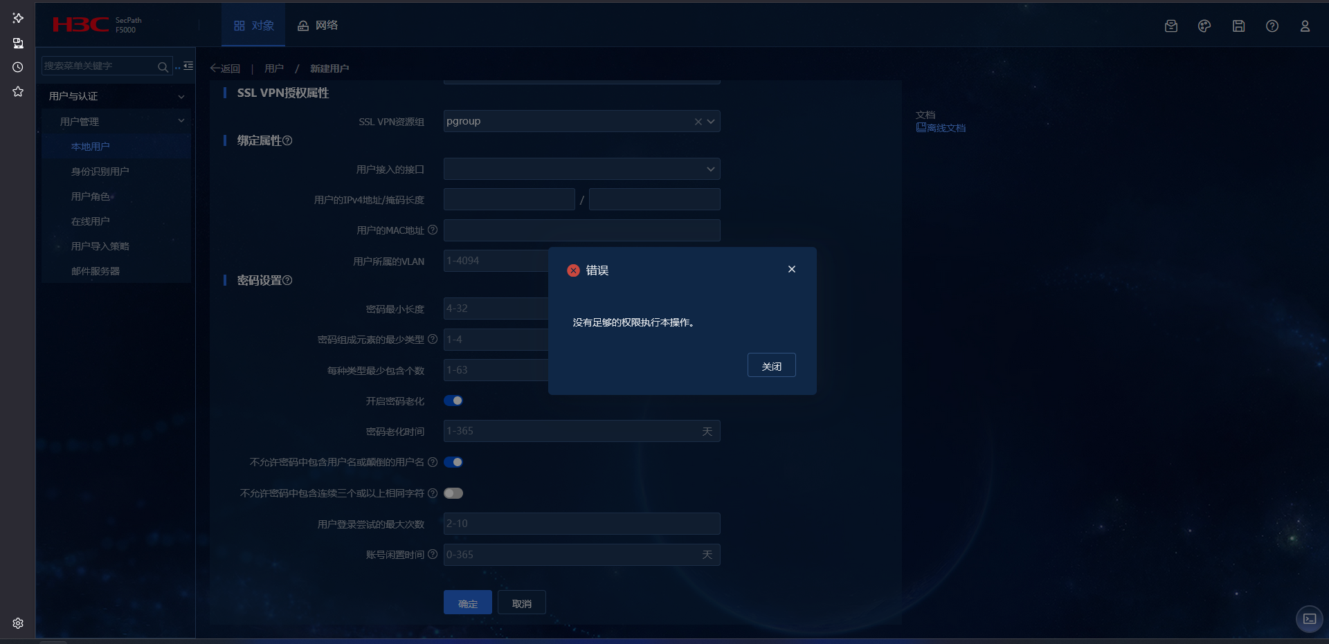 防火墙配置RBAC策略,用户与认证->用户管理设置允许,但是这个权限的用户创建本地用户点击确认时提示没有权限