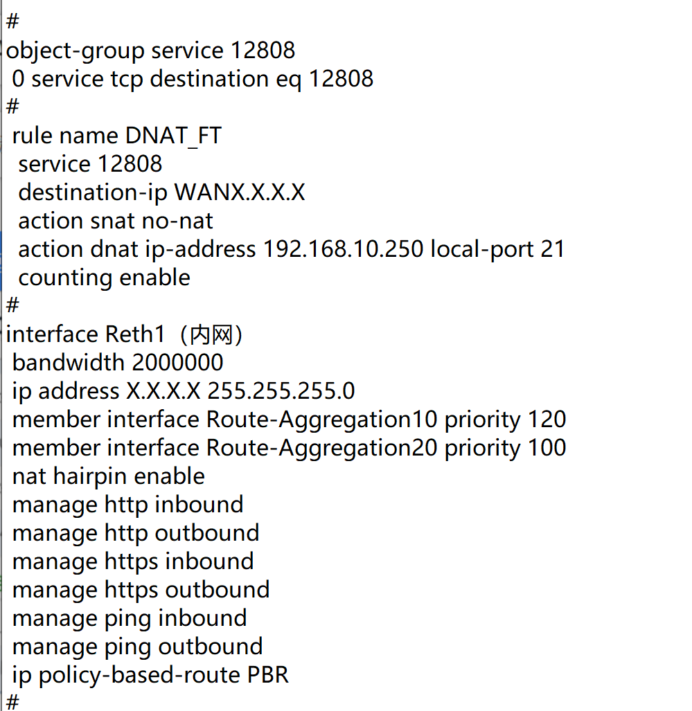 F1000 DNAT服务,外网12808访问正常,内网21访问正常,内网访问出口端口12808数据不回流,下面有web配置截图和部分配置文件
