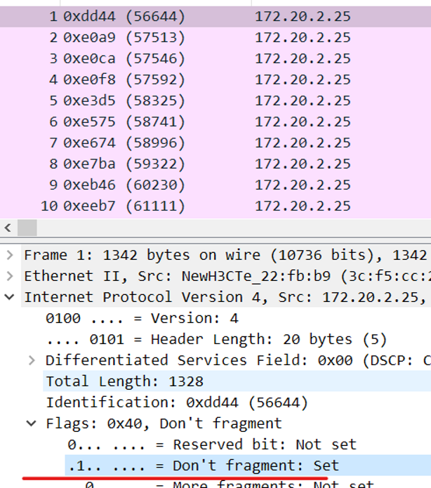 可以看下抓包文件中这个段确认是否分片,下图是不分片