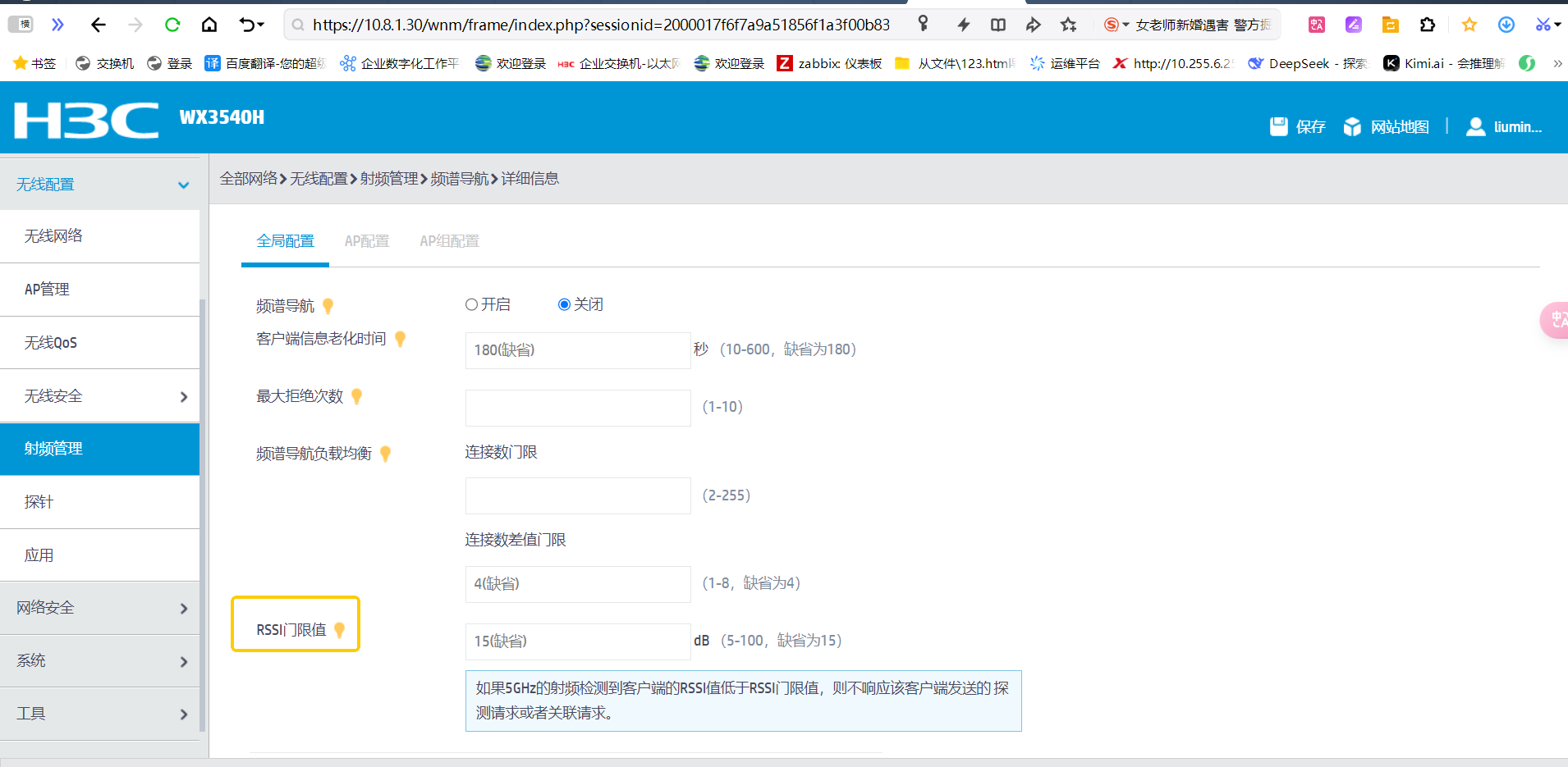 我问一下关于无线RSSI的问题我查着rssi=30 信号强度就是特别好越大越差,但是我看平台写着什么门限值15 rssi你们华三有自己专门转换方式吗?有的话转换是怎么转的,一会一个-75一会一个15 看的头都晕了