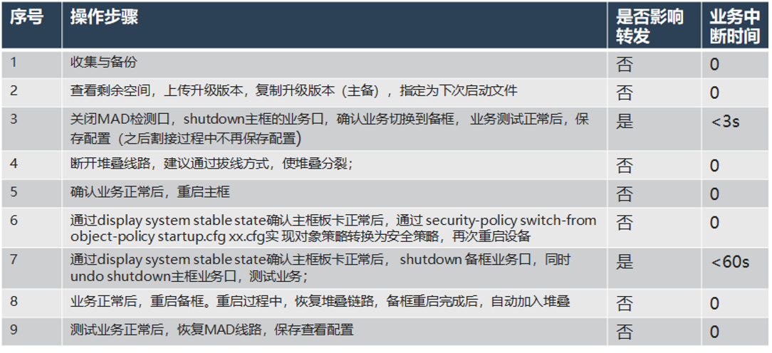 5) 待主框重启确认版本升级正常后,此时主上业务口依然是down的,因为(2)保存了down的配置;等主完全起来后,做链路切换操作,shutdown备上业务端口,完后立即undo shutdwon主上业务端口,具体脚本现场补充,此操作可将业务切换到原来主设备上。注意这里操作过程不要保存配置;