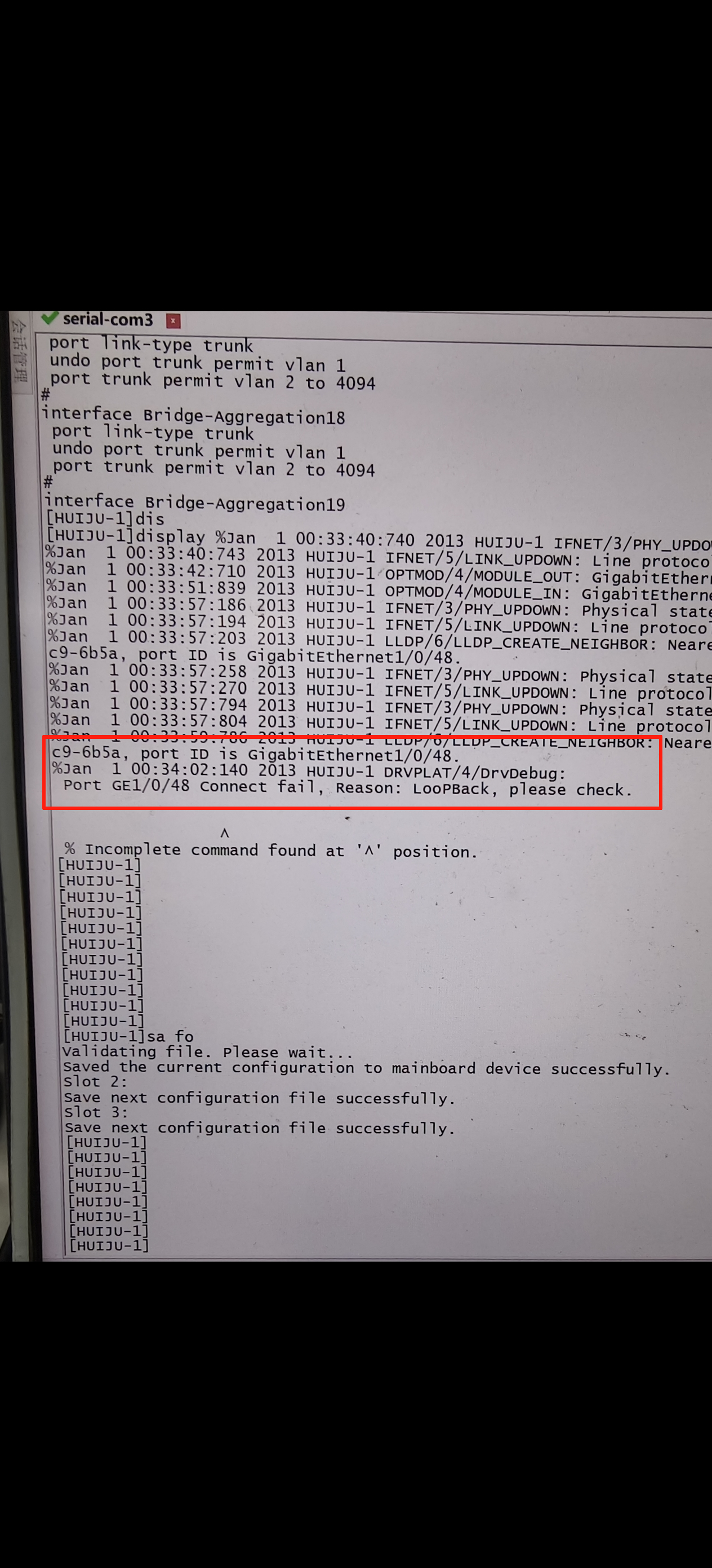 今天四台S5570S-54F-EI做堆叠,四台做成链型可以堆叠成功。就是第四台和第一台连起来,环型堆叠起不来,物理接口能正常亮。而且第四台和第一台的irf的物理成员口报错,如图Port GE1/0/48 connect fail, Reason: LooPBack, please check。这是什么原因造成的啊