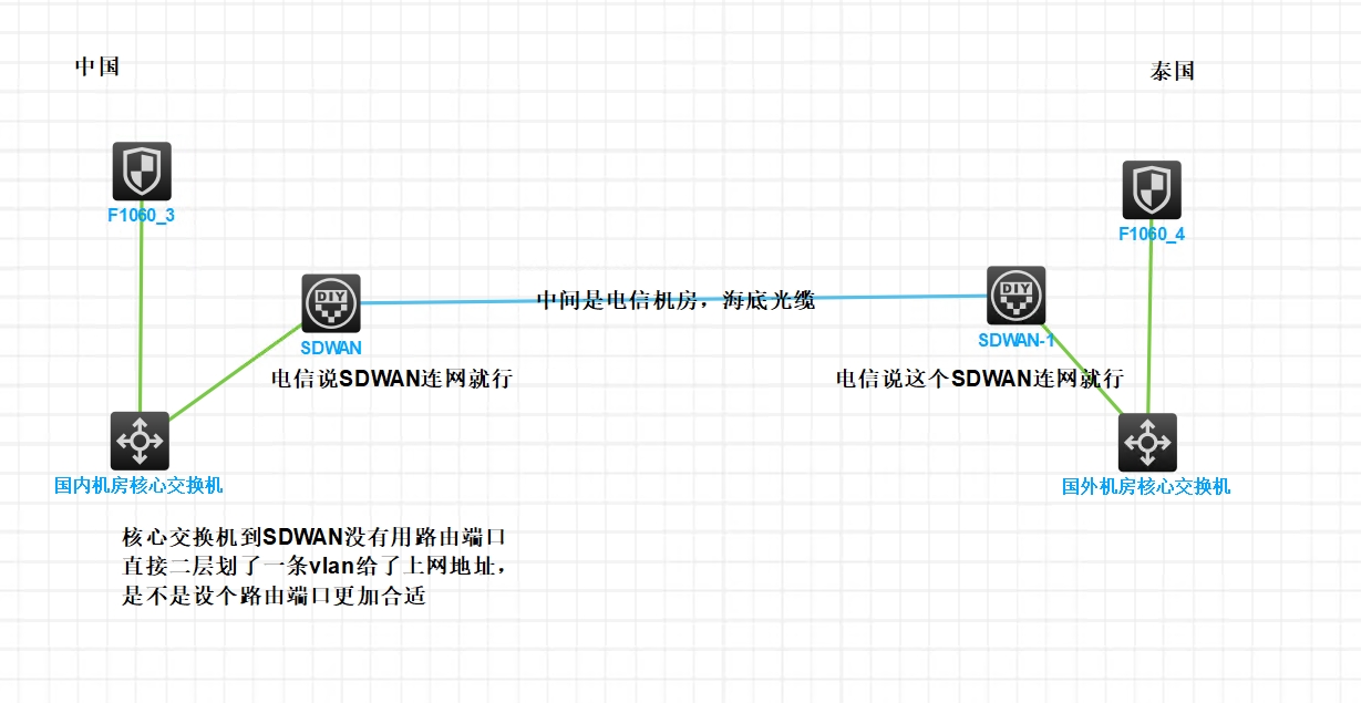 我司新布一条跨境SDWAN,现在核心交换机划了一条VLAN给SDWAN设备设置一个IP上网,电信说SDWAN设备--国内电信机房---海底光缆---国外电信机房---SDWAN设备--国外机房核心交换机,现在问题是,核心交换机和SDWAN设备相连是三层路由端口比较合适还是没啥区别,三层路由端口的话是不是,在防火墙上还要做一下NAT地址转换,三层路由端口的流量从公网出去,请教一下其他公司的跨国SDWAN是怎么布的