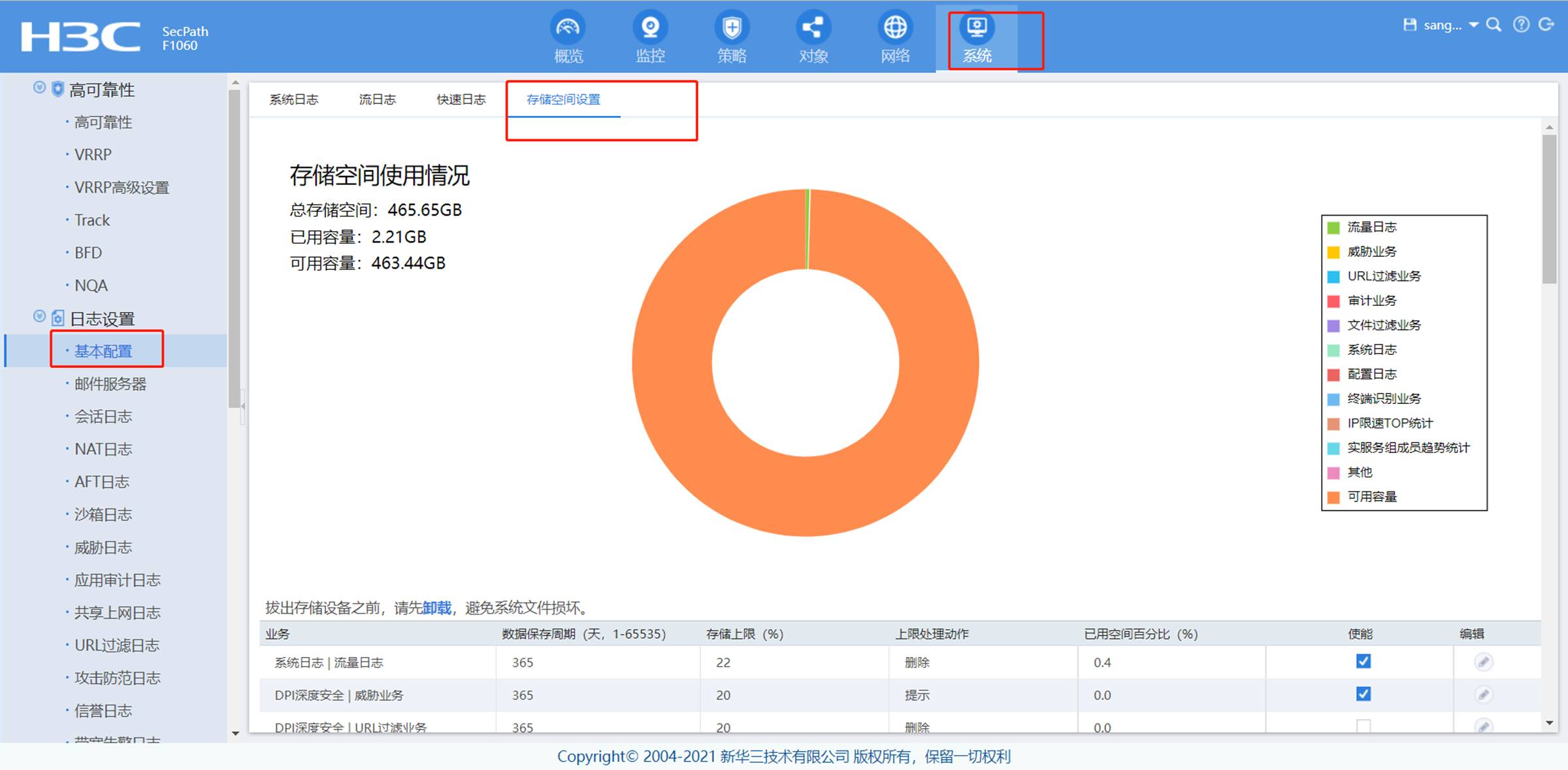 重点检查一下日志设置—>基本配置—>存储空间设置中,是否开启系统日志、审计业务日志等
