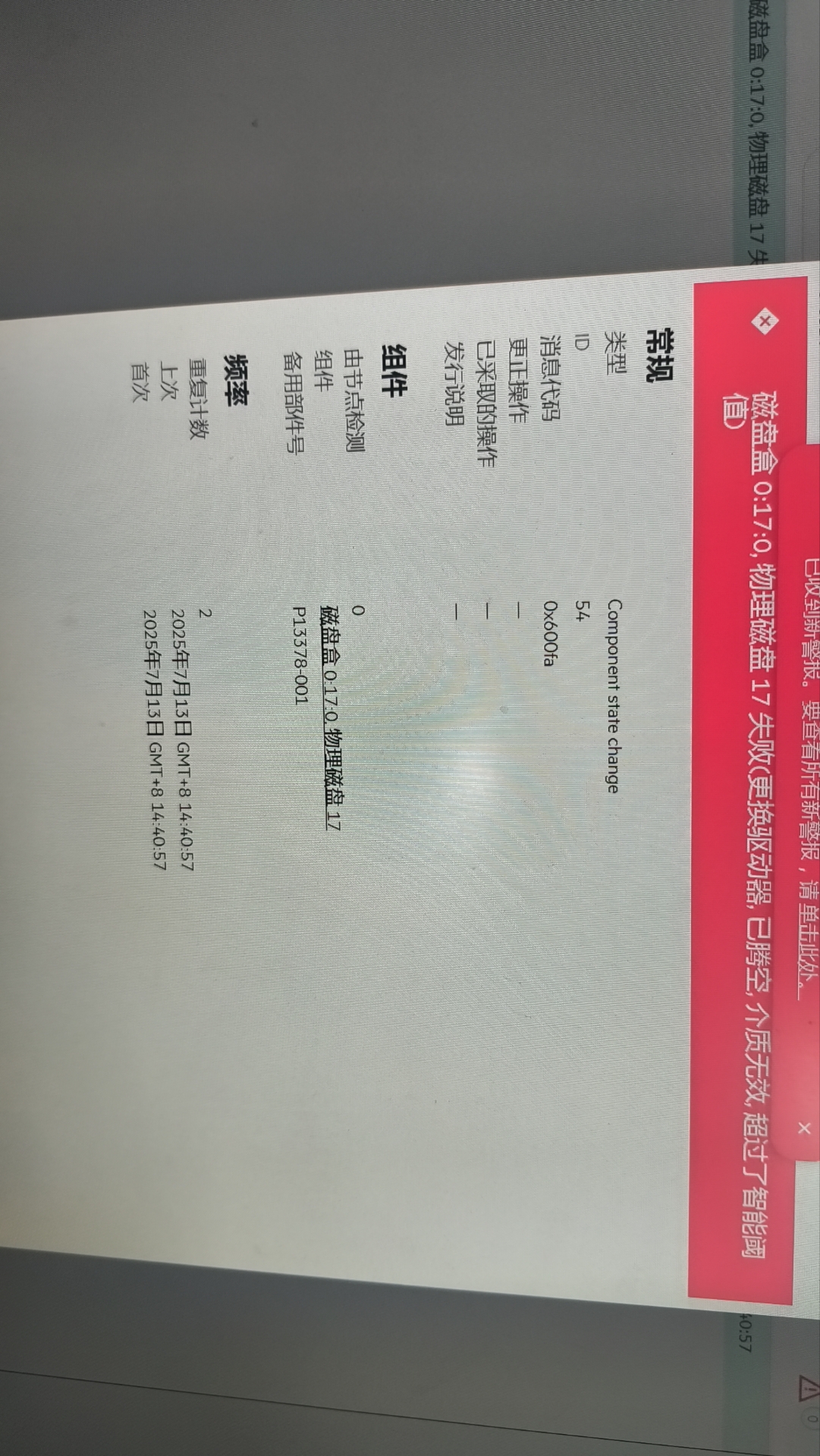 您好,这是存储设备(大概率是服务器硬盘相关)的磁盘故障报警,报错 “磁盘盒 0:17:0,物理磁盘 17 失败(更换驱动器,已腾空,介质无效,超过了智能阈值 )” ,可按以下步骤处理: