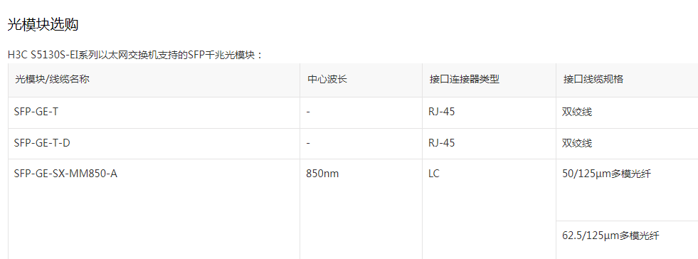 表5-8 SFP口支持的千兆SFP光模块/线缆列表