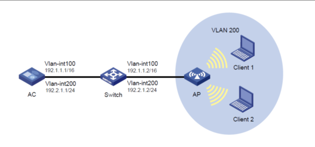 Switch作为DHCP服务器为AP和Client(客户端)分配IP地址。给ap下发的注册vlan是vlan100,注册vlan100网段:192.1.1.0/24,给无线客户端下发的业务vlan是200,业务vlan200网段:192.2.1.0/24,交换机充当无线客户端的网关。