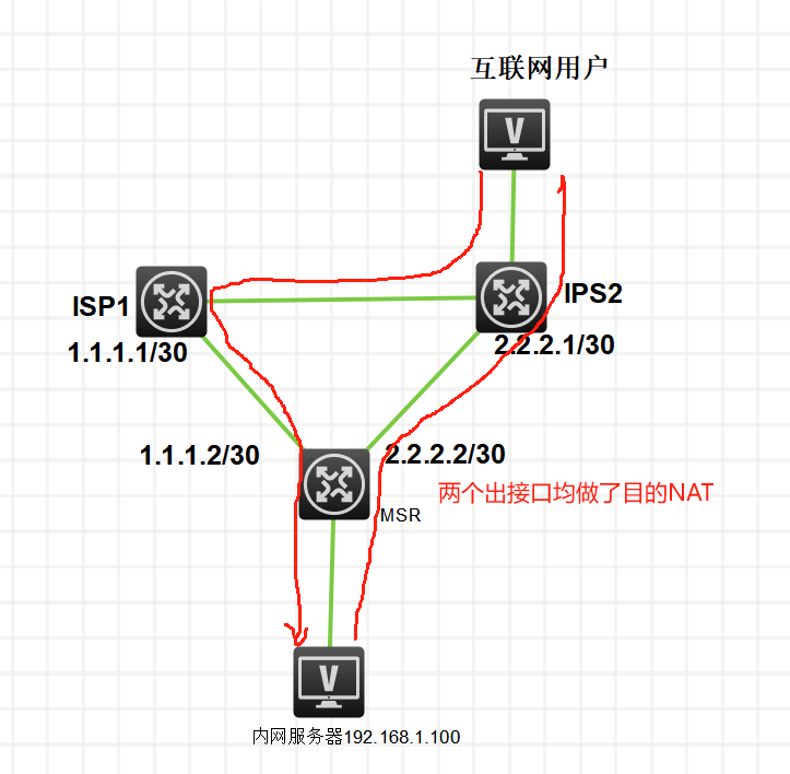 如图,出口路由器上联两个电信的线路:ISP1和ISP2。在出口路由器上的两个接口都做了针对192.168.1.100的目的NAT,并开启了ip last-hop hold。但是互联网用户访问1.1.1.2地址时候,跟踪路径是从2.2.2.2回去的。并没有走1.1.1.2回去。找了很多资料没有解决,还是说MSR不支持源进源出功能?