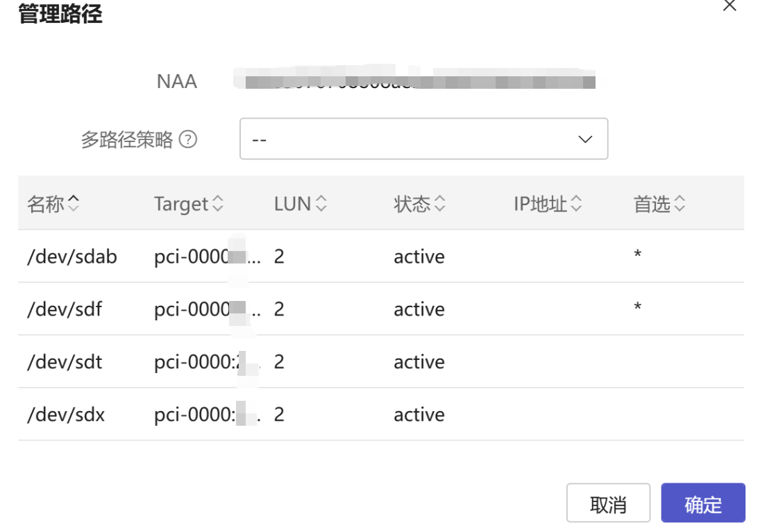 每台主机2个HBA卡,一共4条路径,看multipath是开启的,但是多路径管理里面看是--没有设置的
