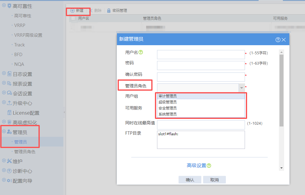 admin)登录防火墙的Web管理界面。启用功能后,系统会强制您创建至少三个管理员账户,并分别分配角色。