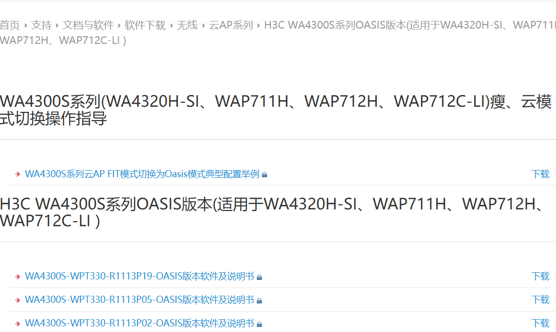 下载页面有教程 H3C WA4300S系列OASIS版本(适用于WA4320H-SI、WAP711H、WAP712H、WAP712C-LI )