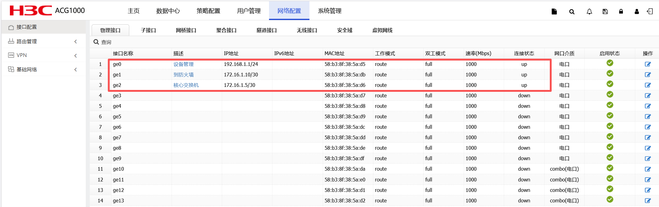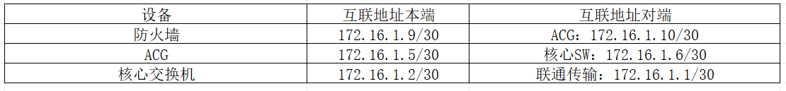 1、ACG与防火墙和核心交换机的互联接口地址,可以互通。