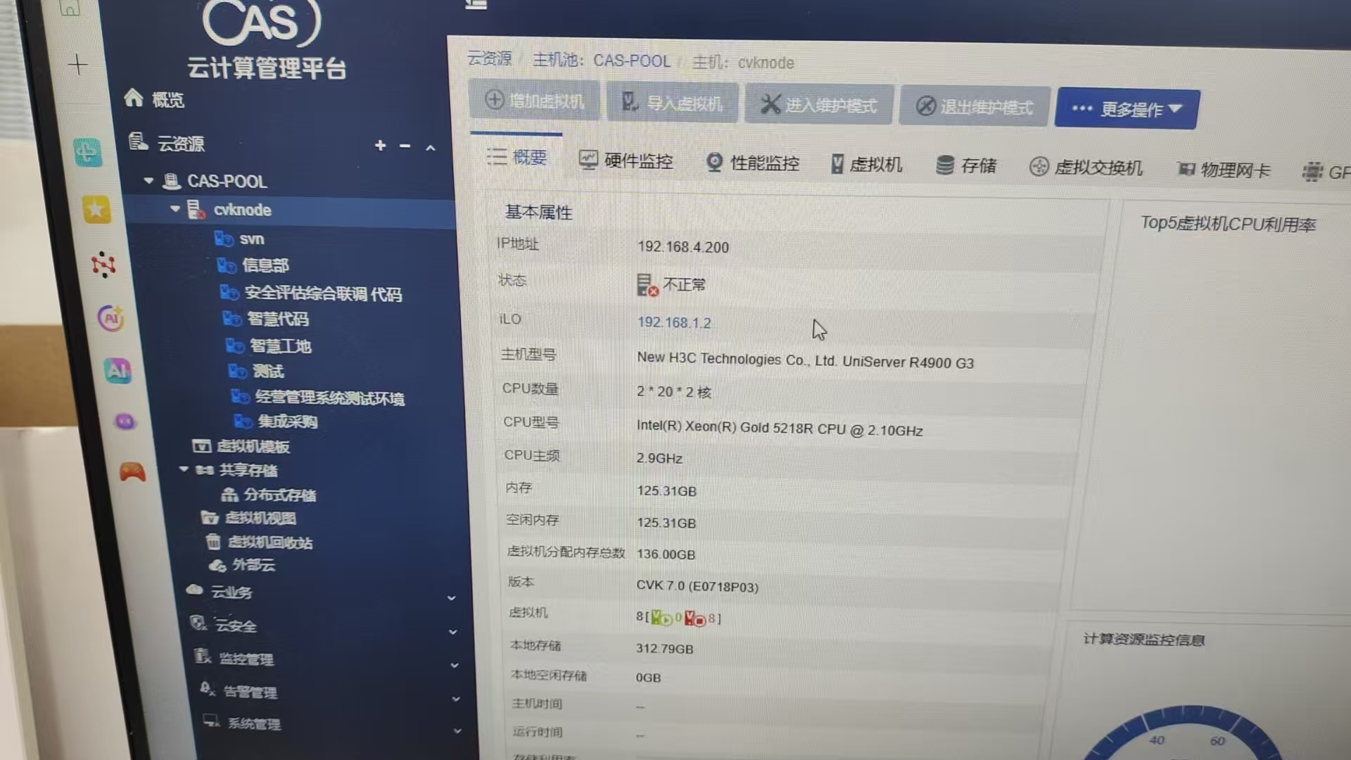 方法一:通过SSH直接连接CVK主机(首选) 这是最直接有效的方法。您需要知道CVK主机的管理IP地址和root用户密码。 1. 使用SSH工具(如PuTTY、Xshell、Terminal)直接连接到 cvknode这台物理服务器。 2. 登录后,执行以下命令,检查和重启CAS管理代理服务: # 检查cas-agent服务的状态 systemctl status cas-agent # 如果服务是stop/waiting状态,则启动它 systemctl start cas-agent # 如果服务是active但异常,则重启它 systemctl restart cas-agent 3. 等待几分钟,然后刷新CAS平台的Web界面,查看主机状态是否恢复正常(绿色对钩)。如果恢复,就可以正常点击“进入维护模式”了。 方法二:检查网络连通性 如果无法SSH连接,说明网络或主机本身问题更严重。 1. 物理层面:检查CVK主机后方的管理网口指示灯是否正常亮起(绿色常亮/黄色闪烁)。 2. 交换机层面:登录到连接该主机的交换机,查看对应端口的状态是否为 up。 3. IP可达性:从CIC管理节点或其他网络设备,尝试 Ping 一下这台CVK主机的管理IP地址。如果不通,则证明是网络链路或IP配置问题。 方法三:通过带外管理口(iLO/iRMC)访问主机 这是最终的解决方案,当主机完全网络失联时使用。华三服务器通常集成有带外管理芯片(类似HP的iLO或Dell的iDRAC)。 1. 找到这台 UniServer R4900 G3 服务器的带外管理口IP地址、用户名和密码。 2. 在浏览器中打开该IP地址,登录带外管理界面。 3. 在这里,您可以: • 查看服务器当前电源状态、健康状况。 • 远程控制服务器,像坐在物理机前一样操作(开启KVM功能)。 • 重启服务器。如果SSH无法连接,这是一个有效的重启方式。 4. 操作建议:通过带外管理口登录后,安全重启CVK主机。服务器重启后,网络服务和cas-agent服务都会随之启动,问题很可能得到解决。 方法四:联系技术支持 如果以上所有方法都无法解决问题,可能涉及更底层的故障,例如: • 操作系统内核崩溃。 • 磁盘文件系统损坏。 • 硬件(如内存、主板)故障。 此时,请务必联系华三的技术支持。他们可以通过分析CAS平台的日志、主机的日志来精准定位问题根源。您提供的这张截图就是向他们求助的很好依据。 总结 步骤 操作 目的 预期结果 1 SSH登录主机,重启 cas-agent服务 恢复管理通信 主机状态恢复正常,可进入维护模式 2 检查物理网络和Ping测试 排除基础网络故障 确认网络连通性 3 通过带外管理口重启主机 强制恢复主机状态 服务器重启后各项服务恢复正常 4 联系华三技术支持 解决底层硬件或系统故障 获得专业解决方案 请您优先尝试方法一(SSH重启服务),这是最常见且最快速的解决方法。 如果连不上,再使用方法三(带外管理重启)。