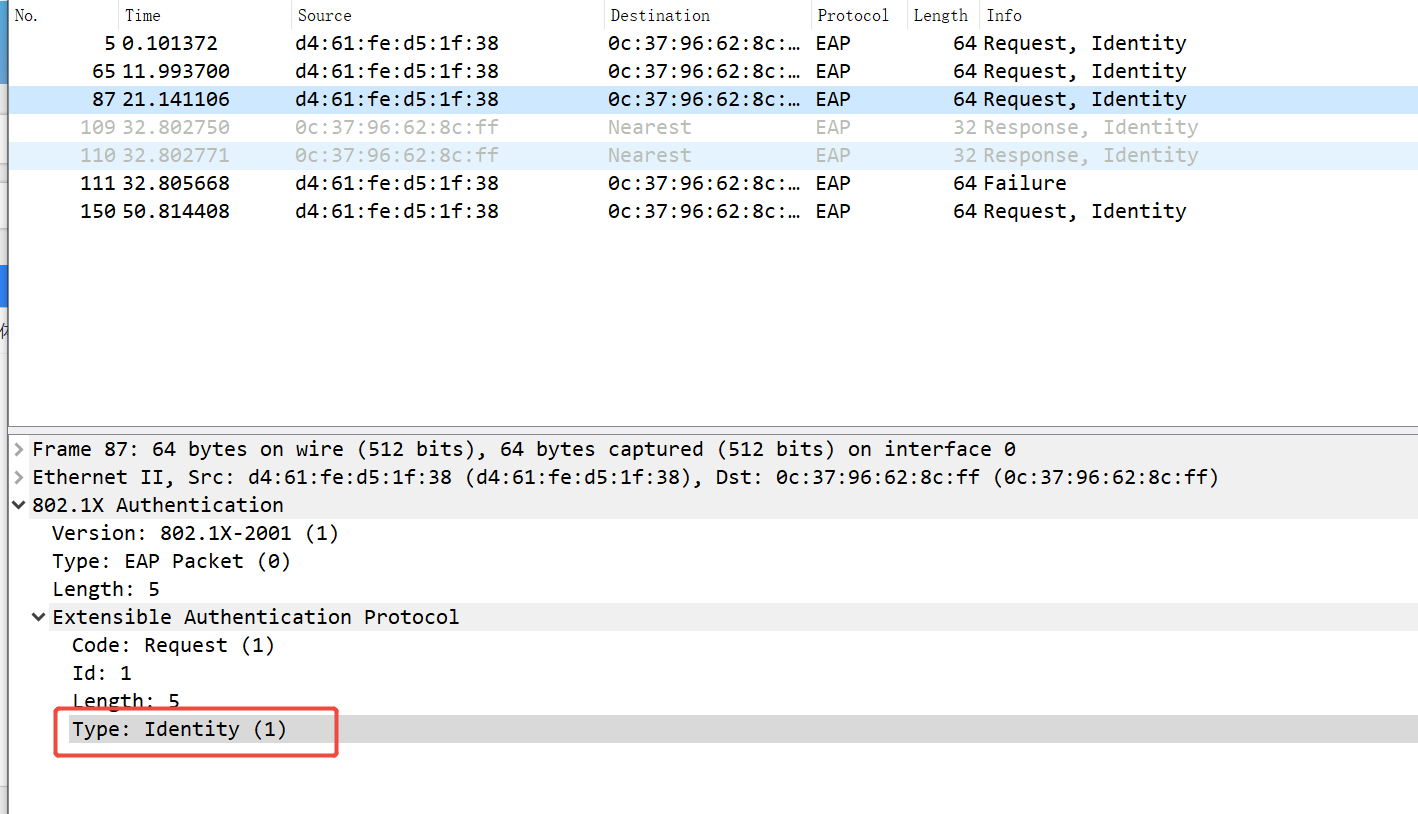 设备端收到认证请求帧后,将发出一个Identity类型的请求帧(EAP-Request/Identity)要求用户的客户端程序发送输入的用户名。