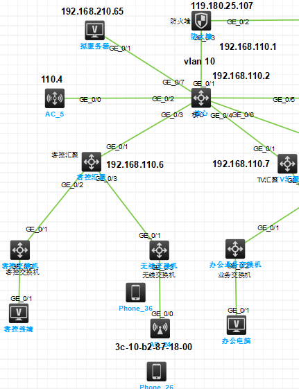 在配置完防火墙,核心交换机,汇聚交换机,接入交换机的情况下,终端的设备和无线都能自动获取到IP地址(核心充当的DHCP服务器),终端设备ping防火墙管理地址(192.168.110.1)和其他设备管理地址都可以ping通,终端设备去ping防火墙外网119.180.25.107ping不通,防火墙里也配置了安全策略放通,核心,防火墙,汇聚写有路由。