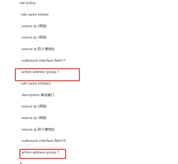 nat address-group 2 name snat-pool2 address 112.21.33.2 112.21.33.2 rule name toInter2 description 移动接口 source-ip 2网段 source-ip 3网段 source-ip 防火墙地址 outbound-interface Reth10 action address-group 2 大佬这样是否就对了吗?