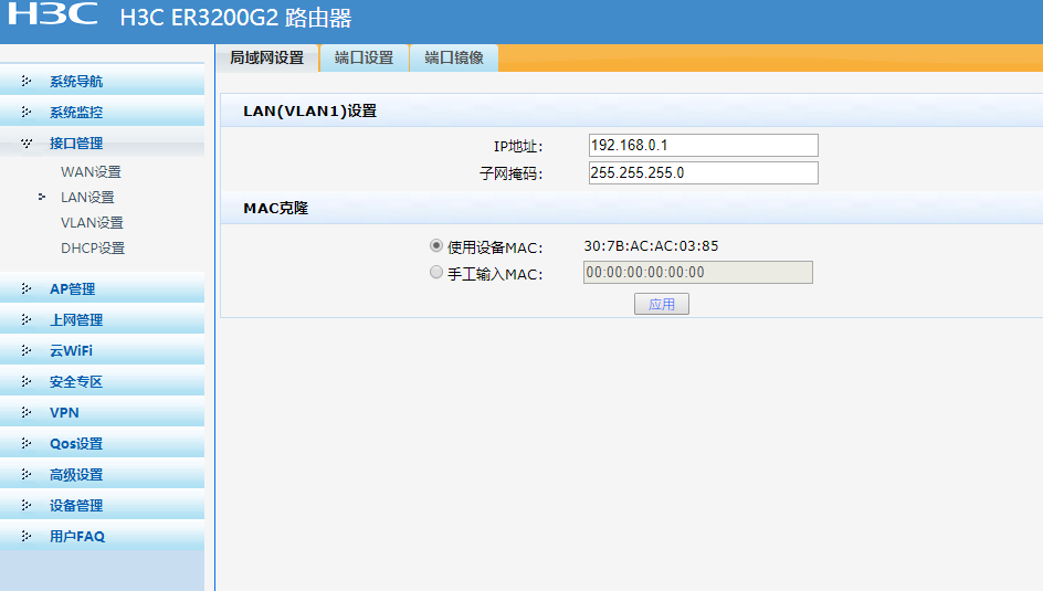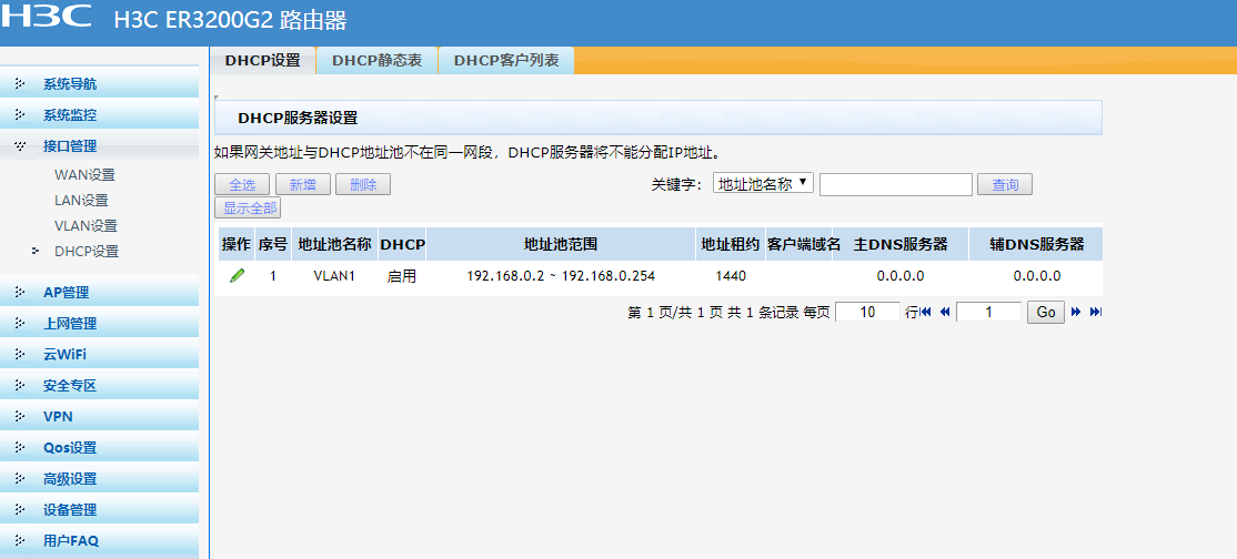 现已使用H3C ER3200G2为全网络的电脑及设备已做好了DHCP分配: 网关 192.168.0.1 DHCP池 192.168.0.2-254;