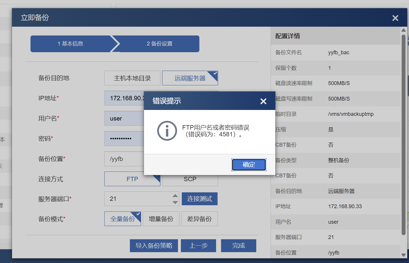 如图,CAS远端备份虚拟机到本机一直提示FTP用户名或者密码错误。确认密码和用户名填写无误