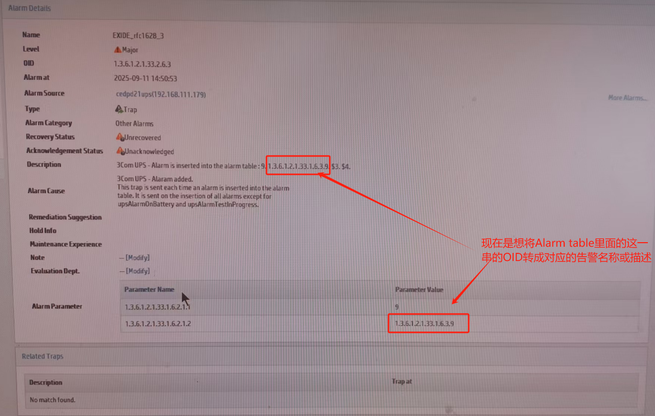 我们有套iMC 7.2的平台 连接ups(不间断电源系统),ups合用的是RFC1628的mib文件。但iMC平台出的告警只有一串数字(OID),要怎么设置才能显示这个告警的描述或者名称。