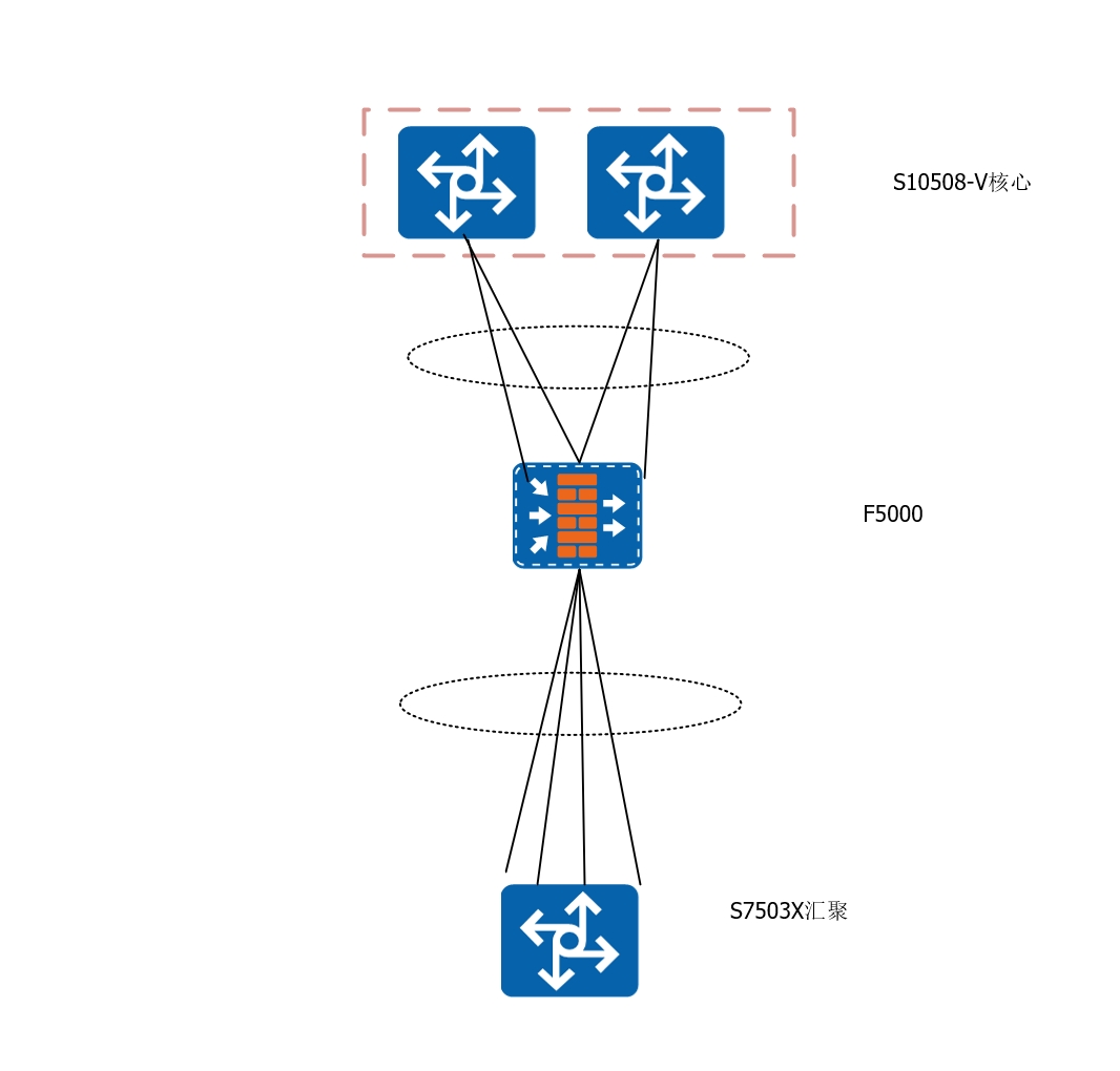 网络拓扑如下图所示,一台F5000在汇聚交换机与核心交换机之间,做二层透传,不做nat,防火墙的上行与下行都做了四线聚合,两个聚合做了桥bridge 1 forward。
