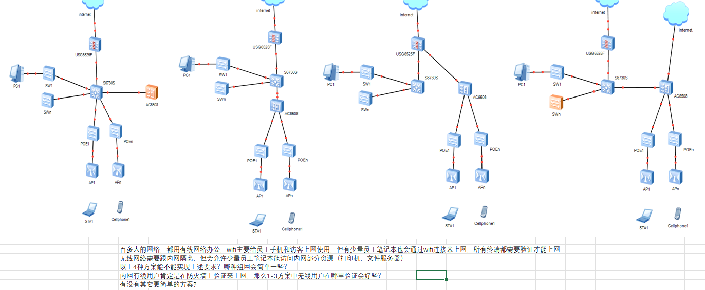 然后是关于有线用户和无线用户上网验证的问题,下面有个图片,大家帮看看哪个组网方案好一点,或者其它更好更简单的方案
