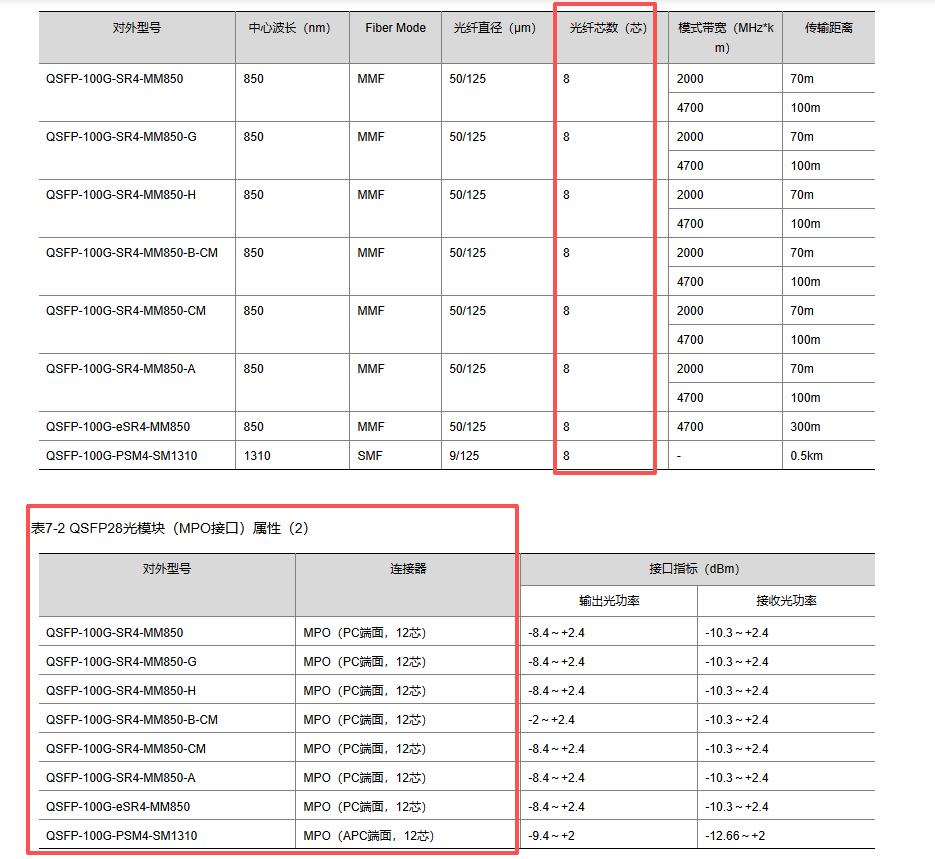 大佬们,QSFP28百G多模块,我看官网参数意思是MPO口是用8芯或12芯都可以吗,推荐用几芯的呢