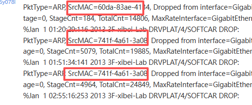 PktType=ARP, SrcMAC=741f-4a61-3a08, Dropped from interface=GigabitEthernet1/0/25 at Stage=0, StageCnt=5079, TotalCnt=19885, MaxRateInterface=GigabitEthernet1/0/26.