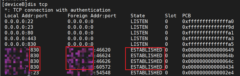 设备上dis tcp看下设备ip到控制器南向地址有没有830端口ESTABLISHED