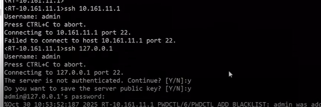 SSH server listening address: 127.0.0.1,说明 SSH 服务仅对本地回环地址开放,需要修改为监听所有接口或指定的设备 IP。display ssh server status,确认监听地址已包含设备的实际 IP。然后尝试通过设备的 IP 地址进行 SSH 连接,如:display acl all查看。up状态,执行display ip interface brief验证。user-interface vty 0 4视图,确认protocol inbound ssh已配置,允许 SSH 协议接入。(0)