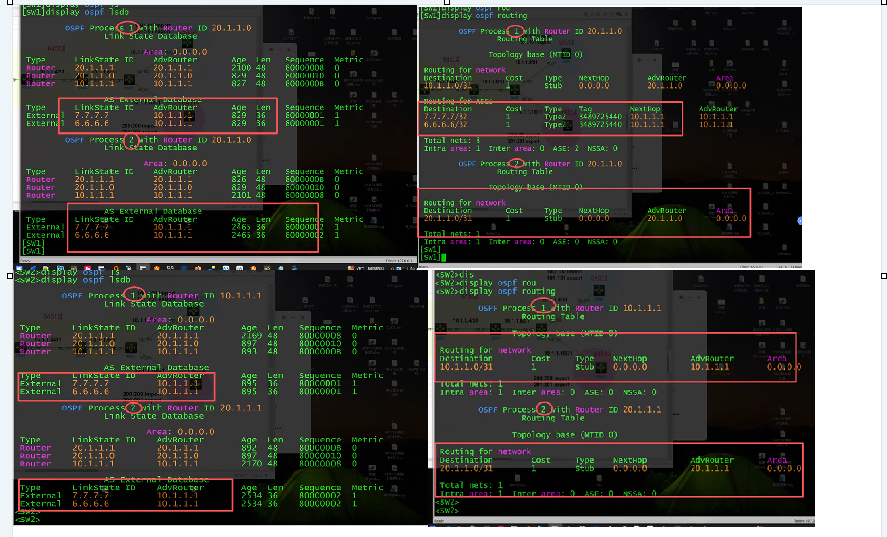 • SW1 的 OSPF 进程 1 引入了 BGP 路由(6.6.6.6、7.7.7.7),这些路由以 **External LSA(Type 5)** 的形式存在于进程 1 的 LSDB 中。