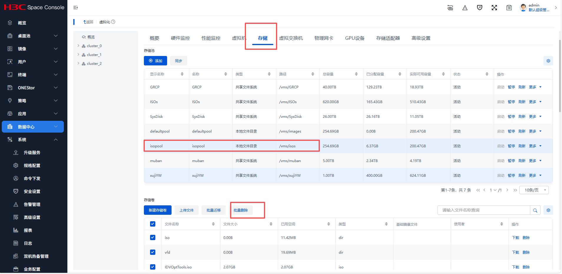 勾选主机-点击存储-点击isopool,路径/vms/isos 下方就能看到这个目录下的文件,勾选要删删除的内容。有批量删除操作的选项