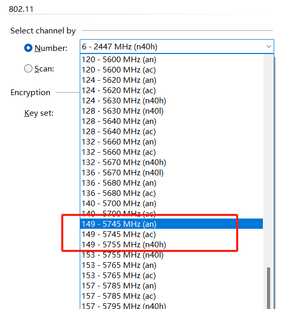 • 149 - 5745 MHz (an):适用于 802.11a/n 协议的网络环境,若你要抓的是支持 802.11a 或 802.11n 协议的设备在 149 信道的数据包,可选择该选项。