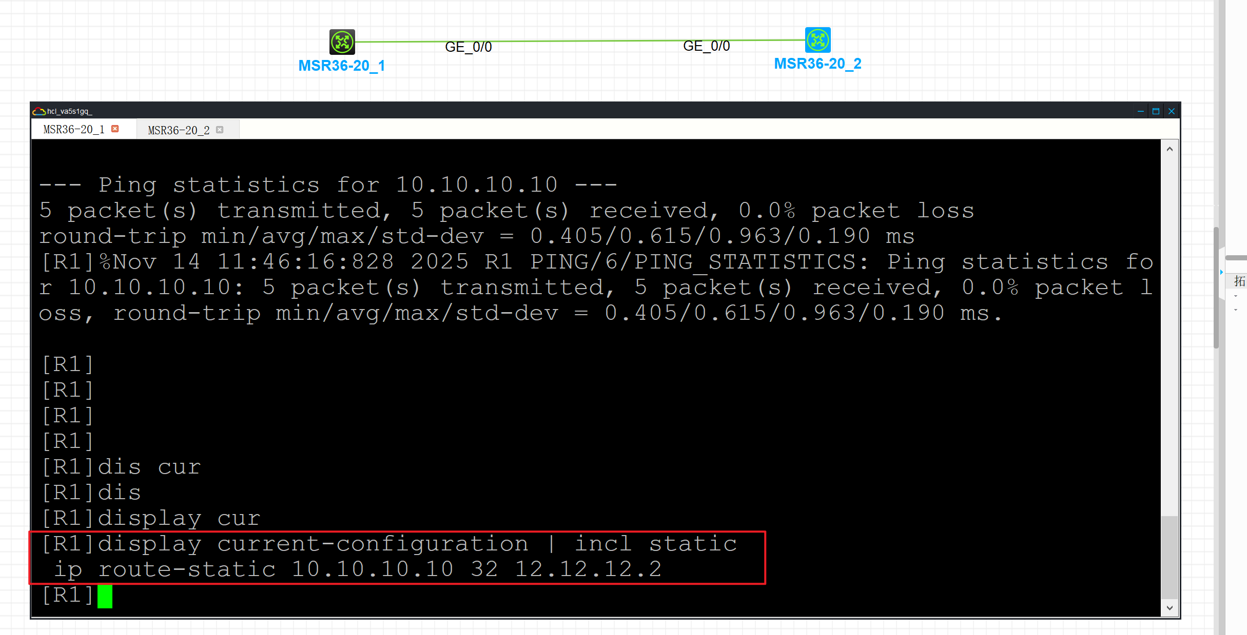 ip route-static 10.10.10.10 32 vpn-instance 1 #去往10.10.10.10 32 的路由进到vpn实例1里面