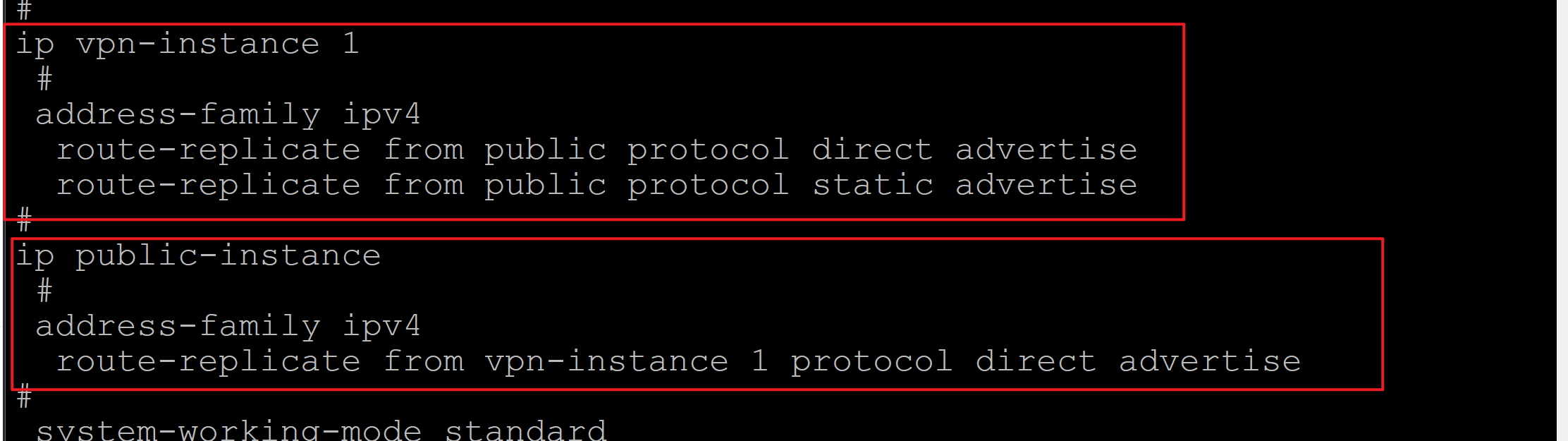ip route-static vpn-instance 1 0.0.0.0 0 public #在VPN实例1里面想要访问任何地址,先从vpn实例1里面出来到公共路由表里 ,看设备,老设备命令不一定支持