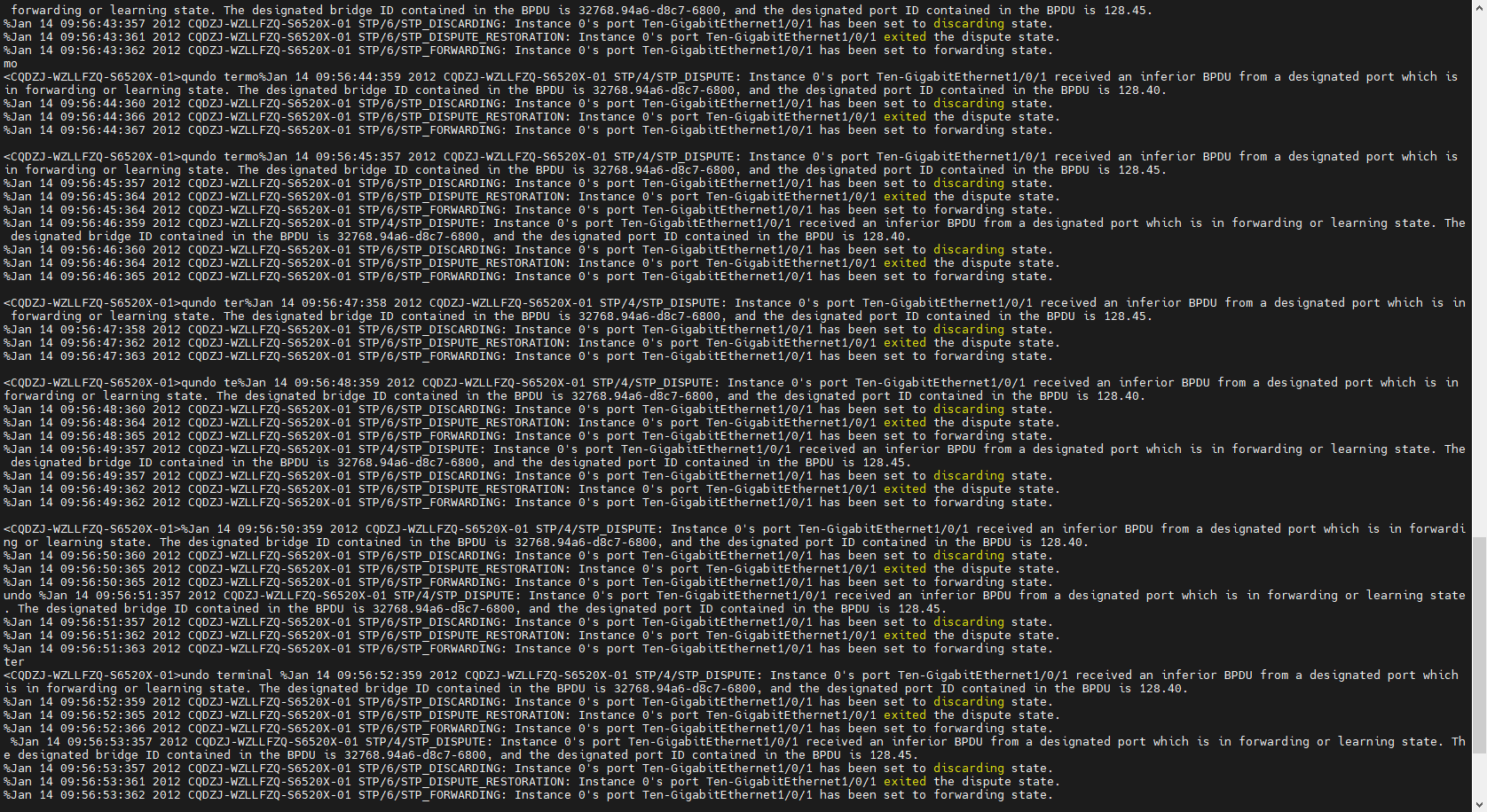 undo %Jan 14 09:56:51:357 2012 CQDZJ-WZLLFZQ-S6520X-01 STP/4/STP_DISPUTE: Instance 0's port Ten-GigabitEthernet1/0/1 received an inferior BPDU from a designated port which is in forwarding or learning state. The designated bridge ID contained in the BPDU is 32768.94a6-d8c7-6800, and the designated port ID contained in the BPDU is 128.45.