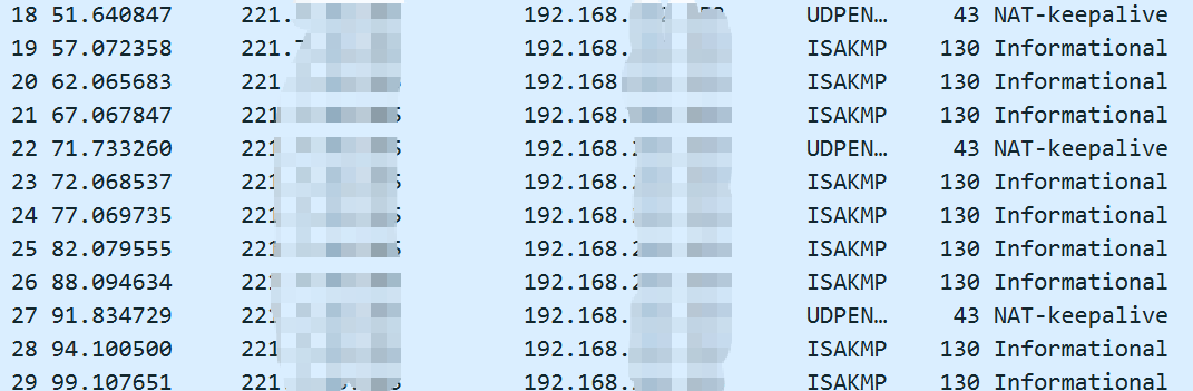 3.华三墙外网口3口抓到了回来的VPN协议报文和数据ESP报文,但在内网口5口只抓到VPN协议报文,没有转发数据ESP报文