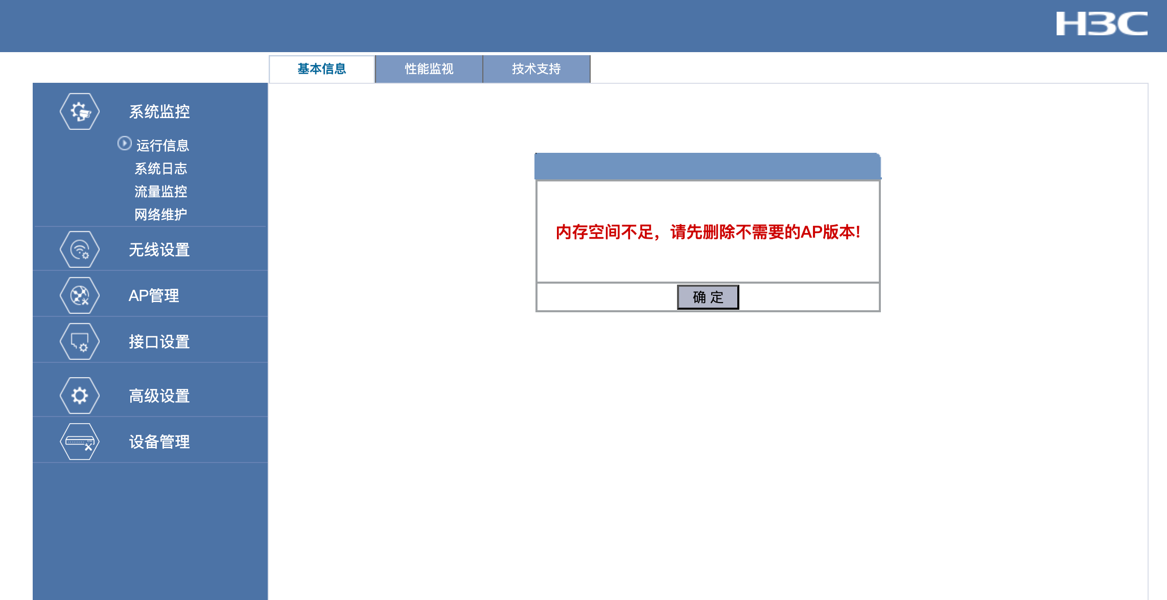 我在H3C BR1008L-HP这款AC的控制台进行版本升级,在上传AP版本时直接报错:“内存空间不足,请先删除不需要的AP版本”,我所上传的固件版本是009这个版本,从这里下载的:https://www.h3c.com/cn/d_202501/2335894_30005_0.htm,下载后将zip文件解压后,将.bin文件进行上传就报错了。而且控制台显示没有其他版本可以删除。